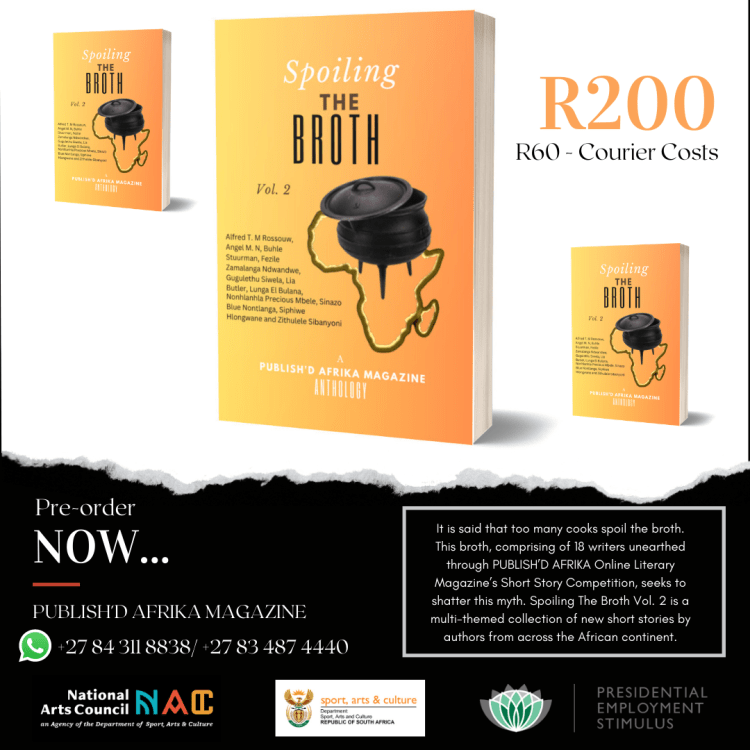 The books, Volume 1 and 2 of Spoiling The Broth, will be released mid-April 2023. While we are working hard to make the book available in book stores, readers are welcome to pre-order their copies from any of your favourite writers featured in this anthology, or you can contact PUBLISH’D AFRIKA directly at info@publishdafrika.com or WhatsApp us at +2783 487 4440 / +2784 311 8838.